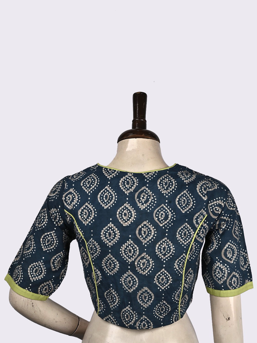 The Hand Block Printed Blouse is a clothig that exudes an ancient aesthetic, often crafted with meticulous attention to detail. The front opening with sustainable coconut buttons and loops, combined with the princess line contrast cord piping, provides a well-defined fit that contours gracefully to the wearer's form. Its design, featuring a closed round neck and half sleeves, adds a touch of timeless elegance, making it a versatile piece that can be dressed up or down for various occasions. Such blouses are not only a testament to traditional craftsmanship but also a celebration of cultural heritage.