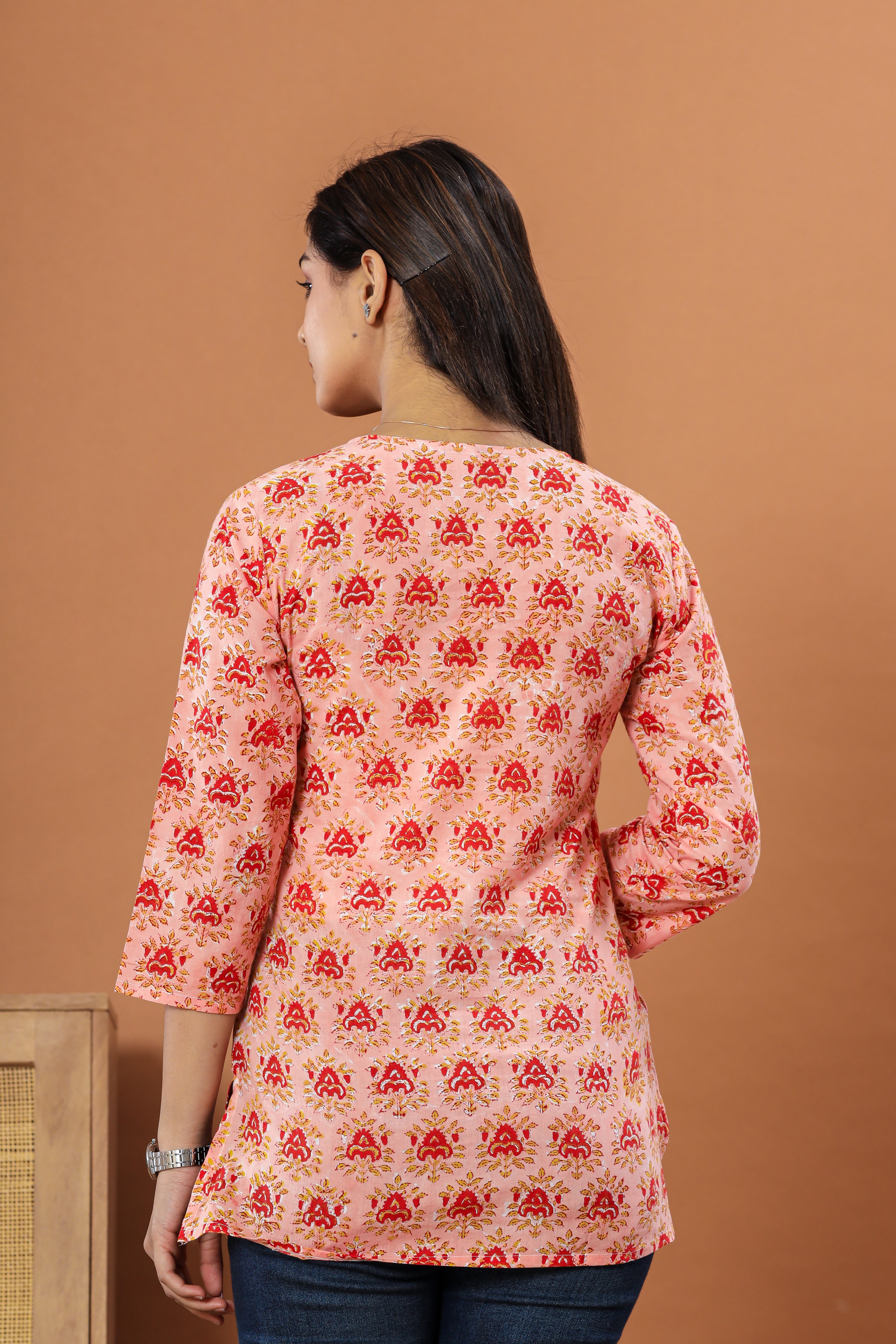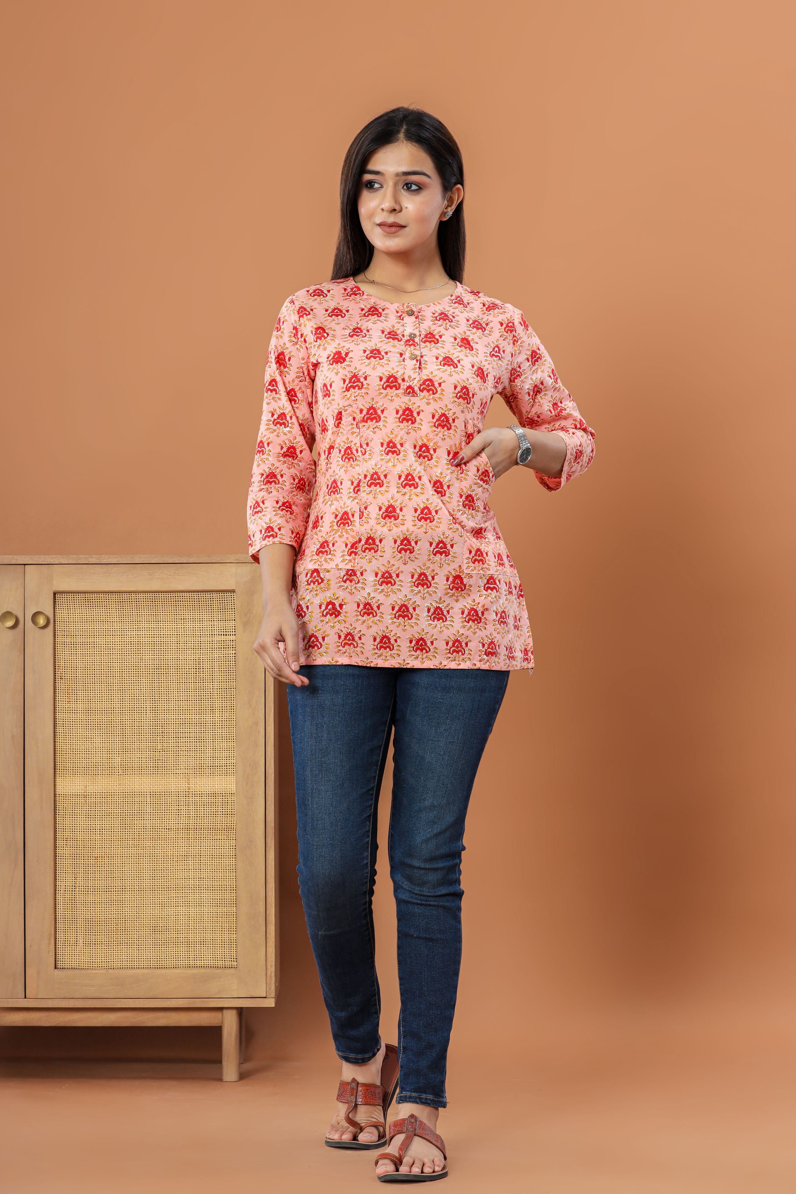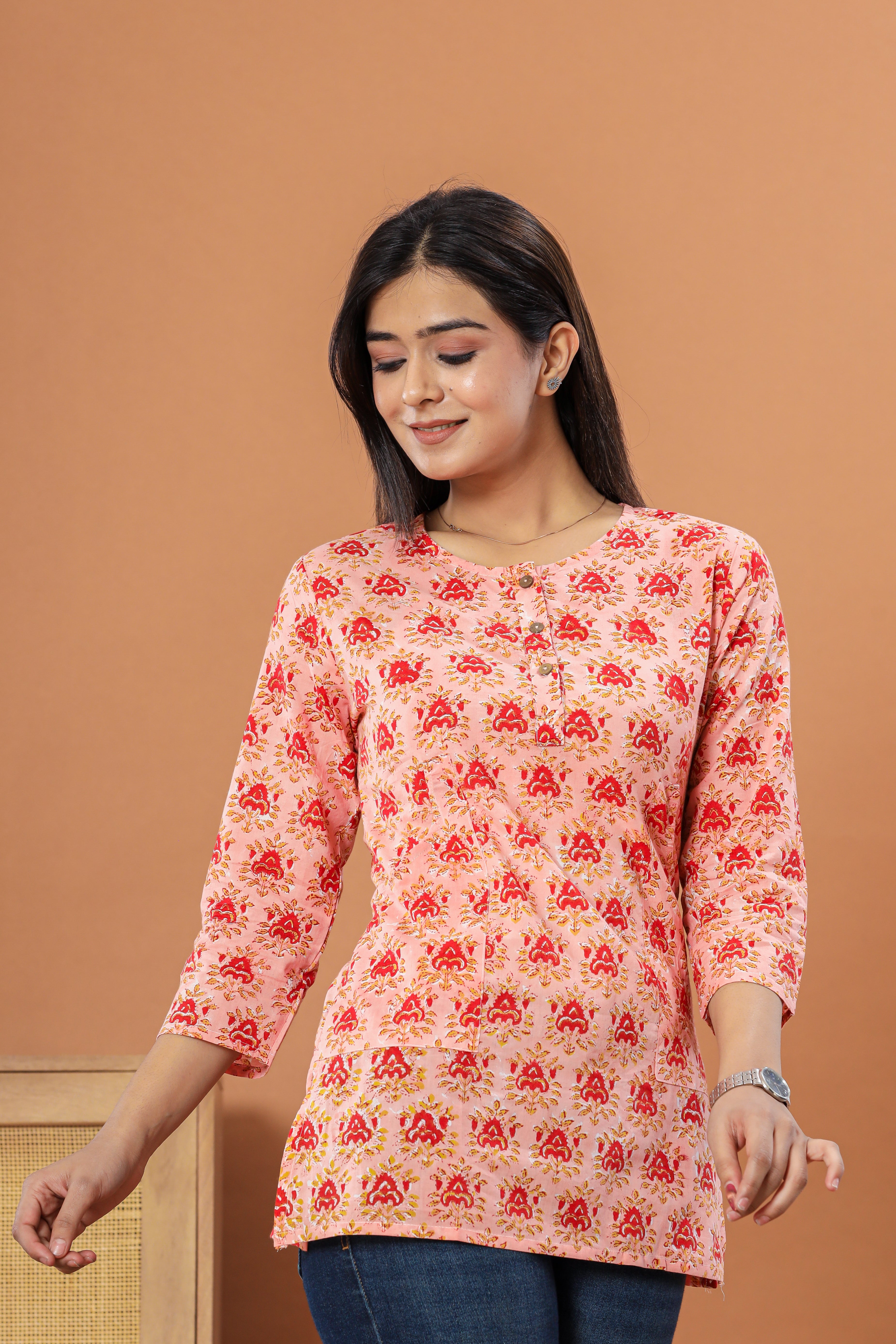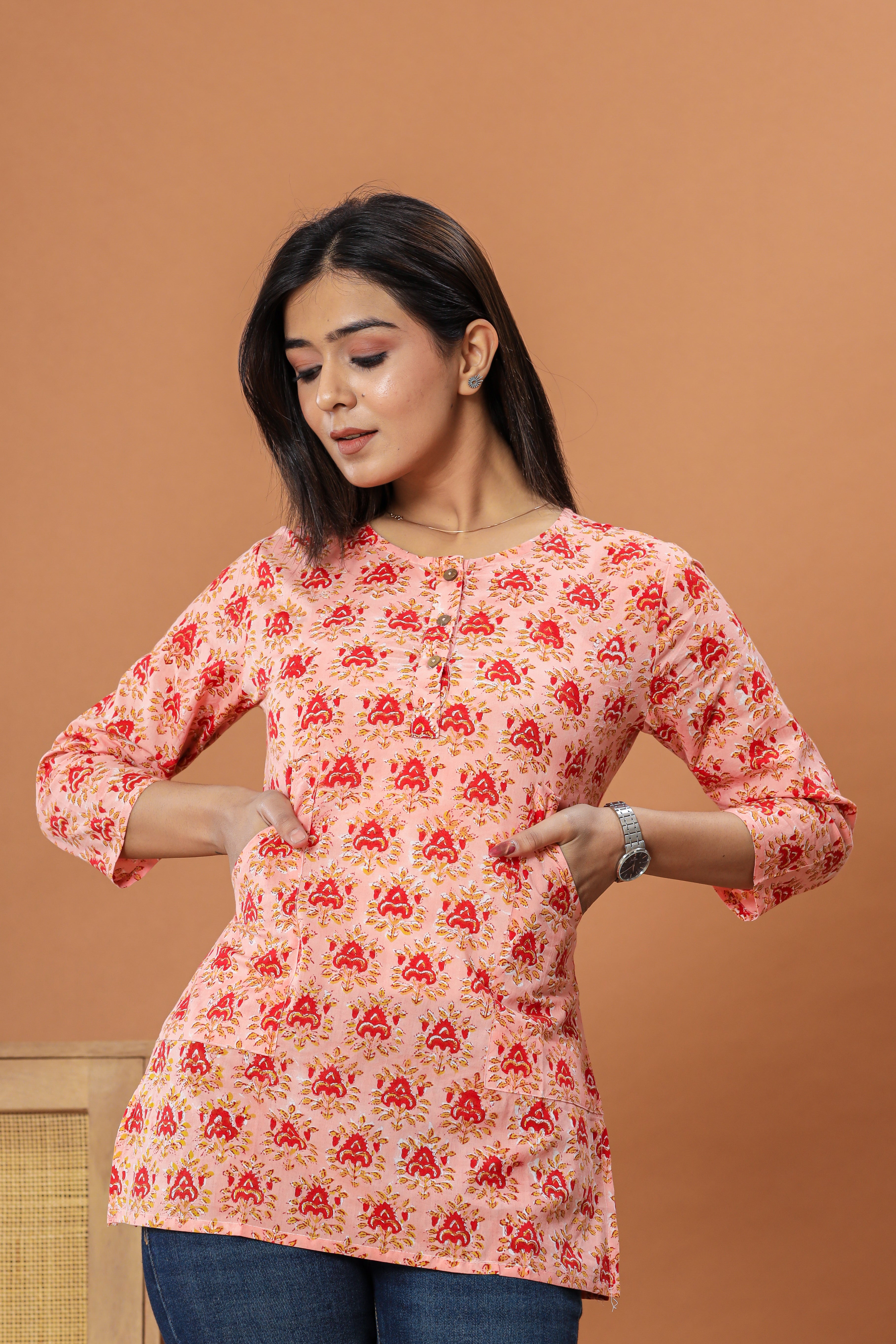 Hand block printed cotton tops are a beautiful blend of traditional craftsmanship and modern design. The intricate patterns, hand-stamped with care, bring a touch of heritage to your wardrobe. The sustainable wooden buttons add an eco-friendly charm, while the kangaroo-style side pockets offer both convenience and style. The thoughtful side slit ensures comfort and freedom of movement, making these tops not just a fashion statement but a testament to the timeless beauty of artisanal work.