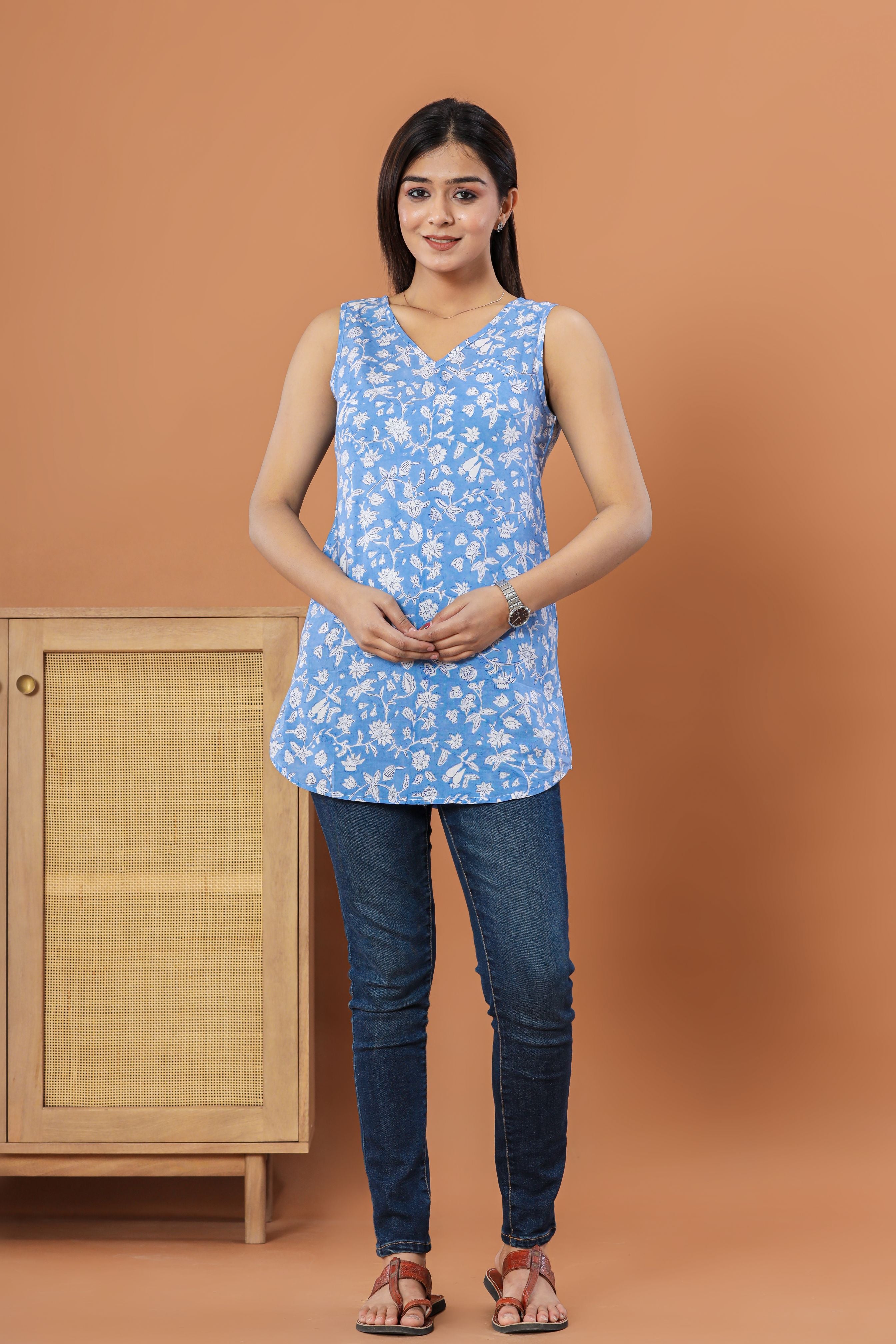 Aasmani Floral Jaal Print Sleeveless Hand Block Printed Womens Tops