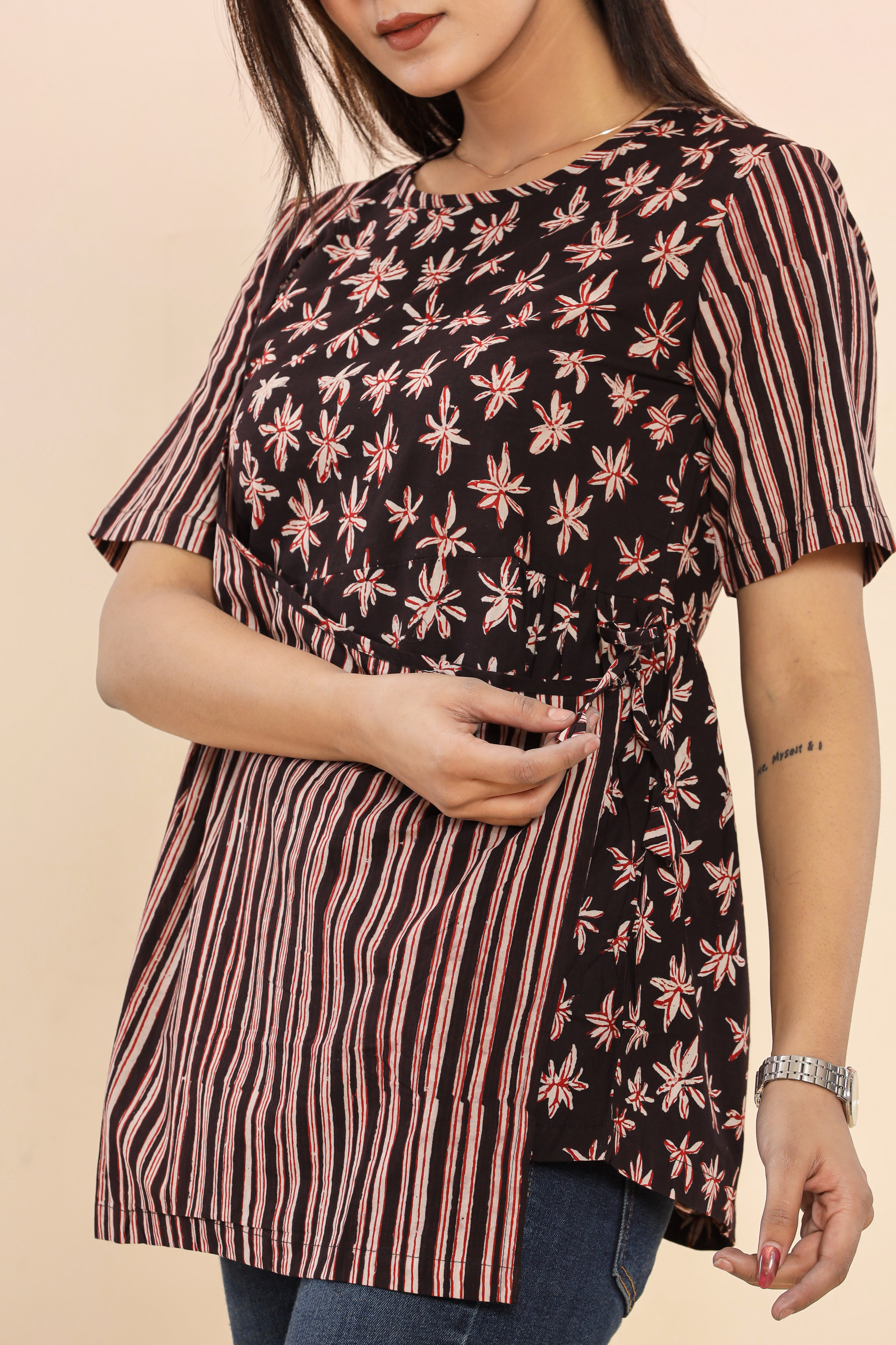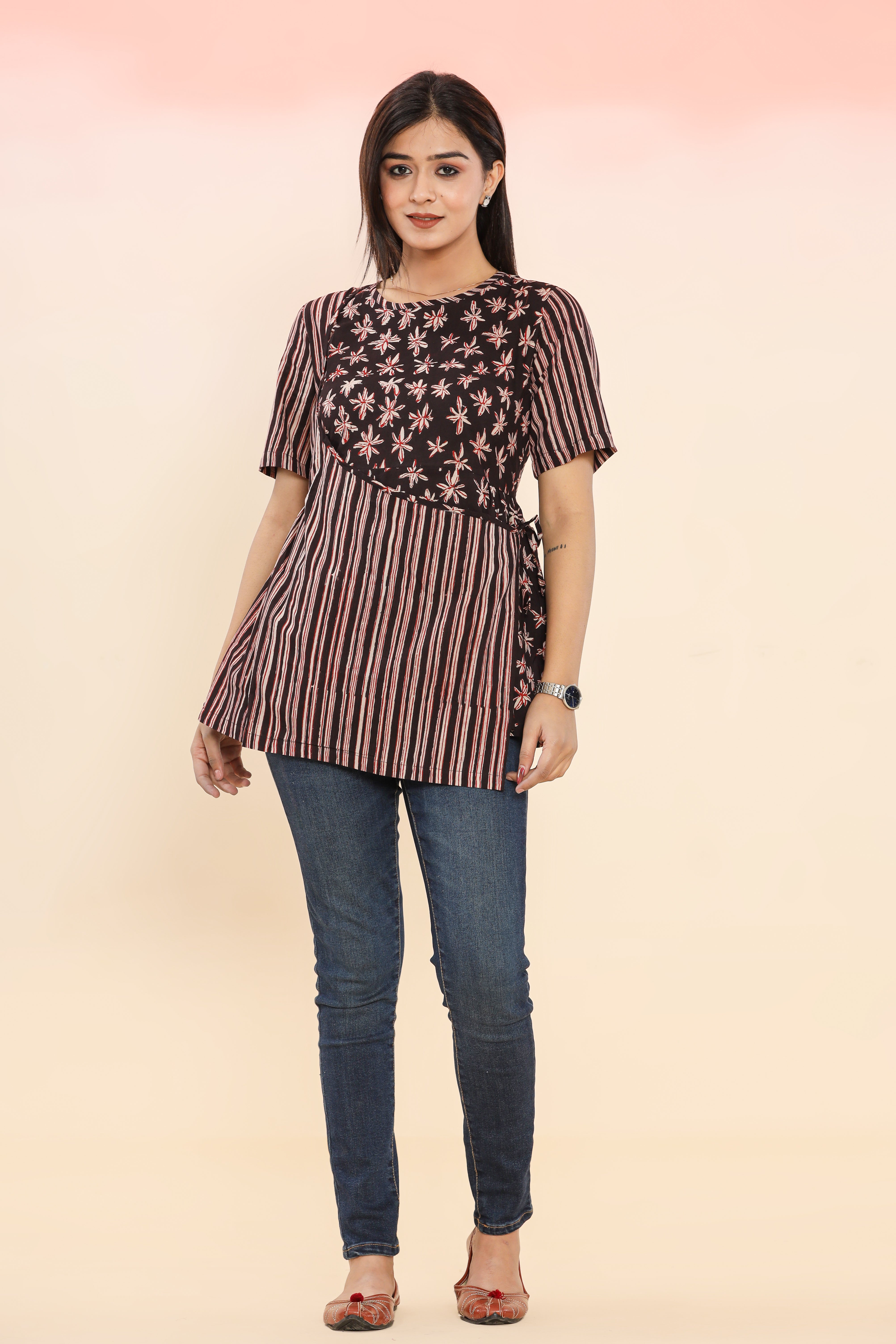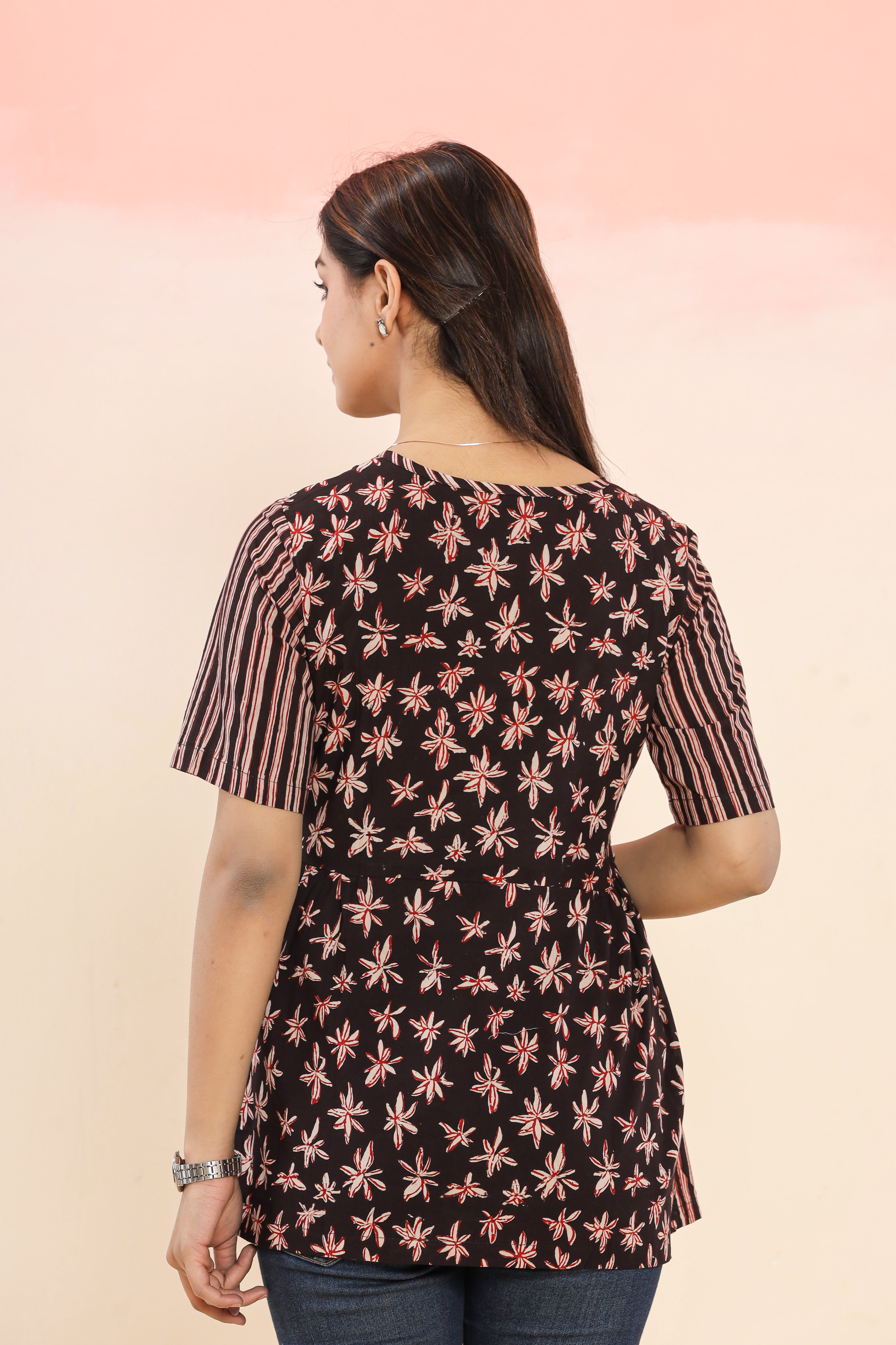 Black Harsinghar Flower Angrakha Womens Hand Block Printed Tops
