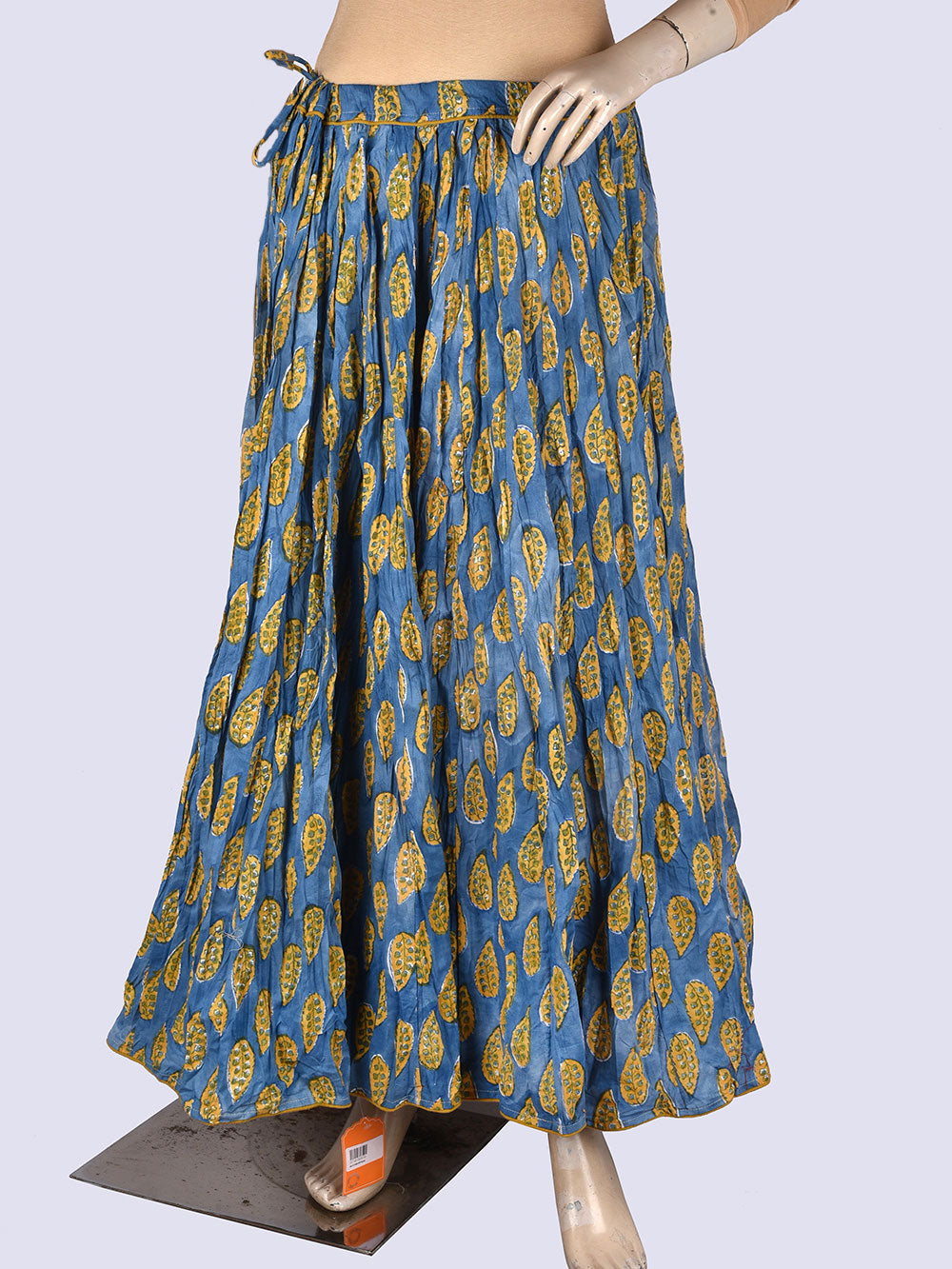 Blues Leaves Hand Block Printed Crinkled Cotton Cambric 48 Kali Kalidaar Skirt