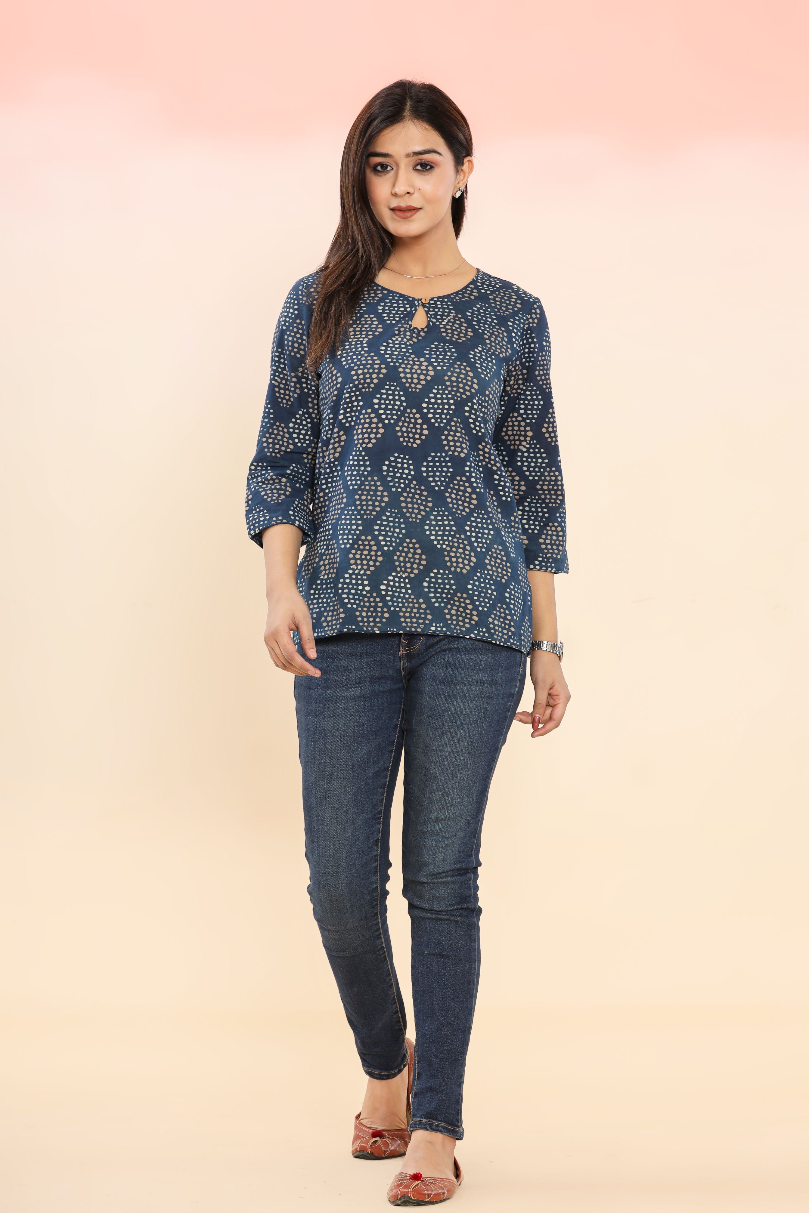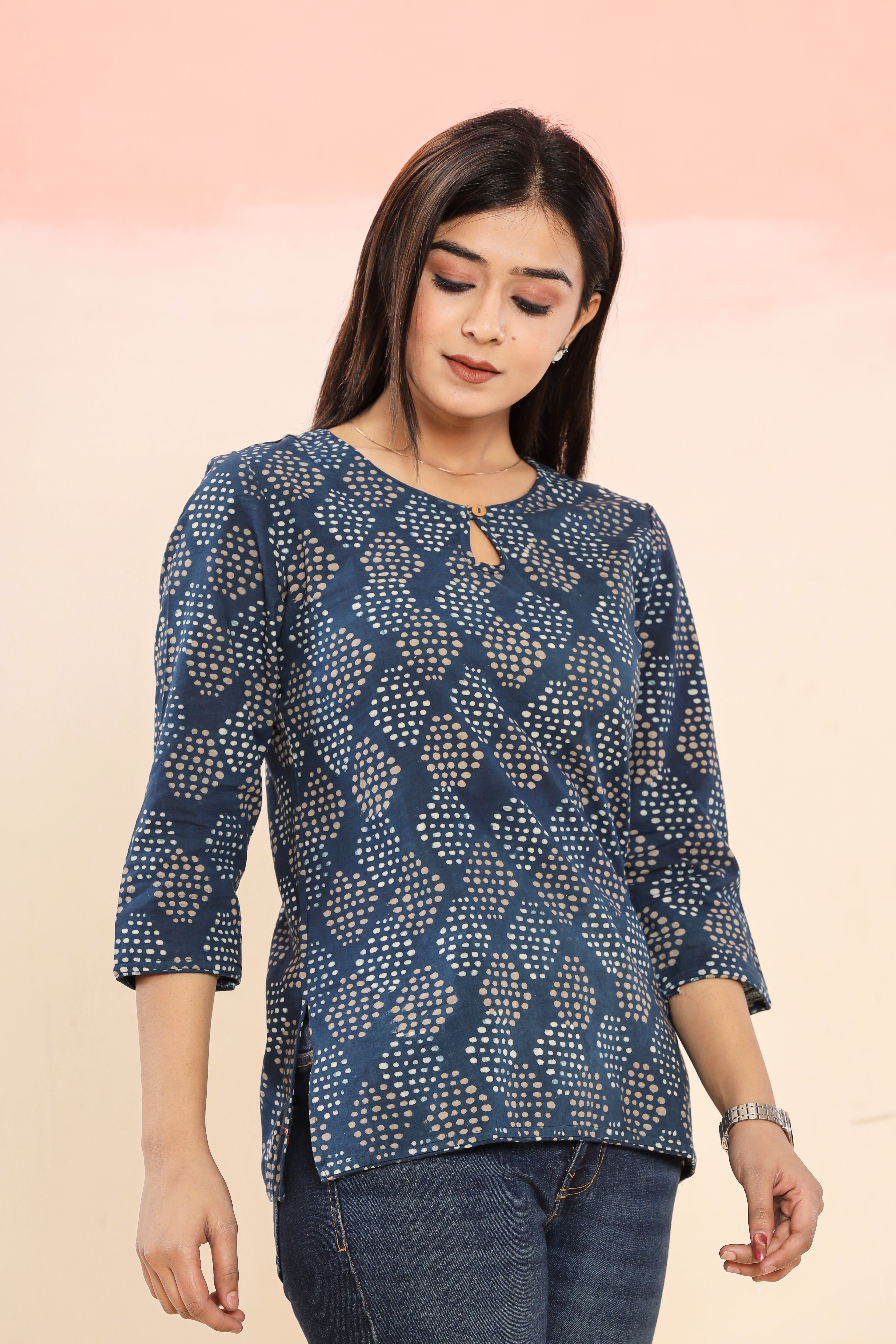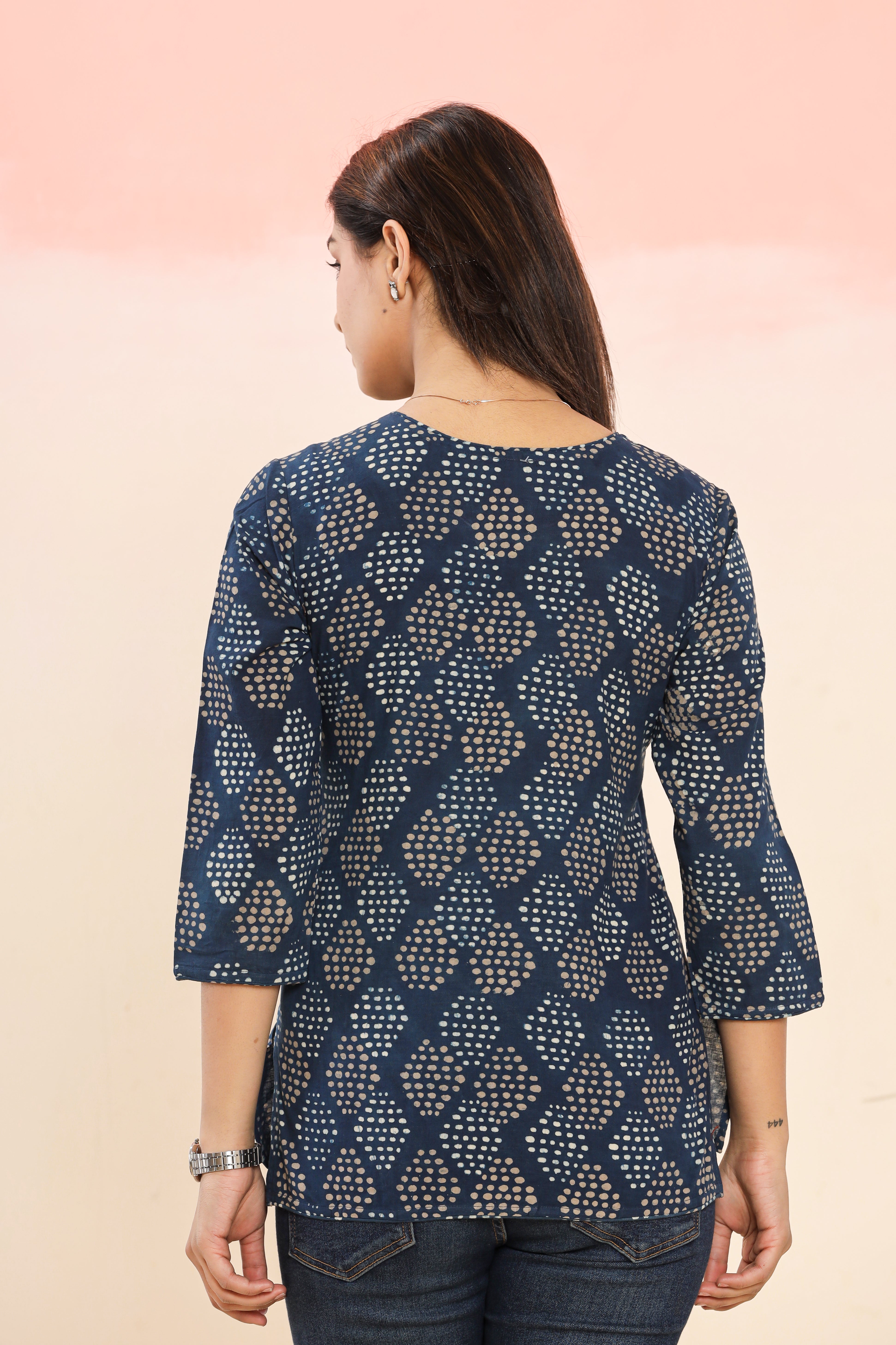 Indigo Diamond Dots Geometric Hand Block Printed Womens Tops