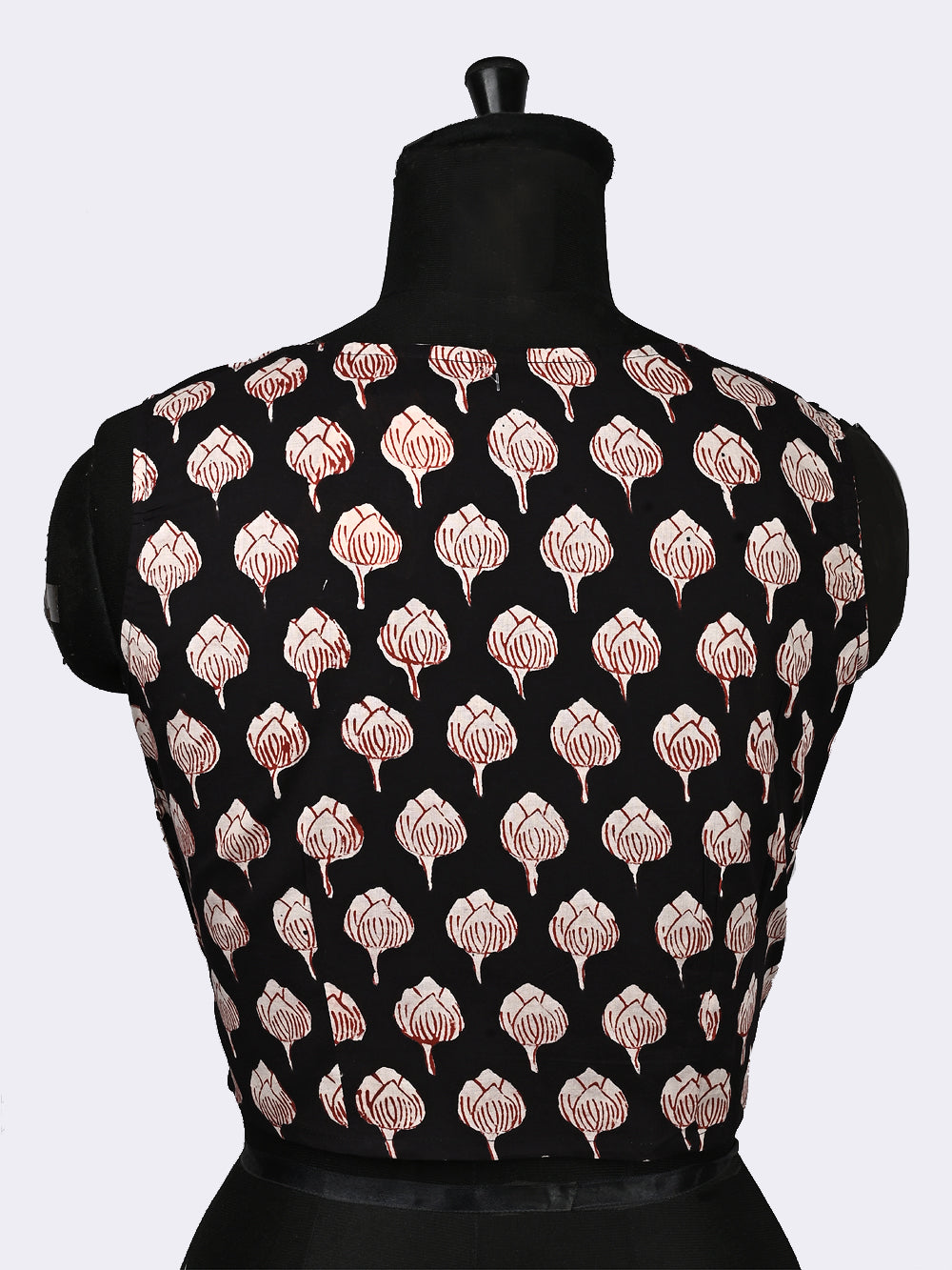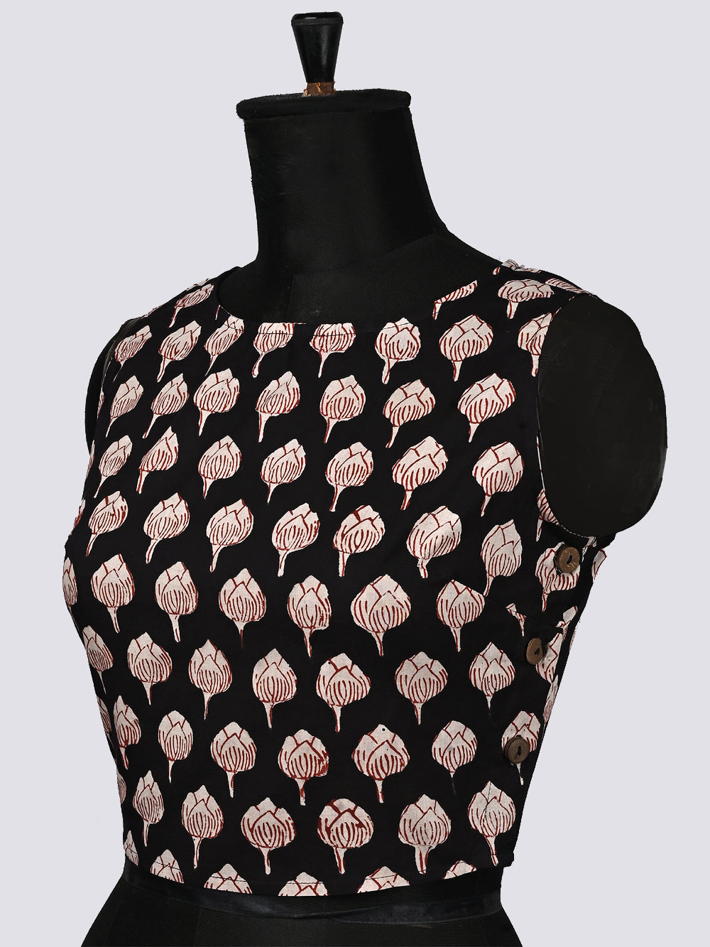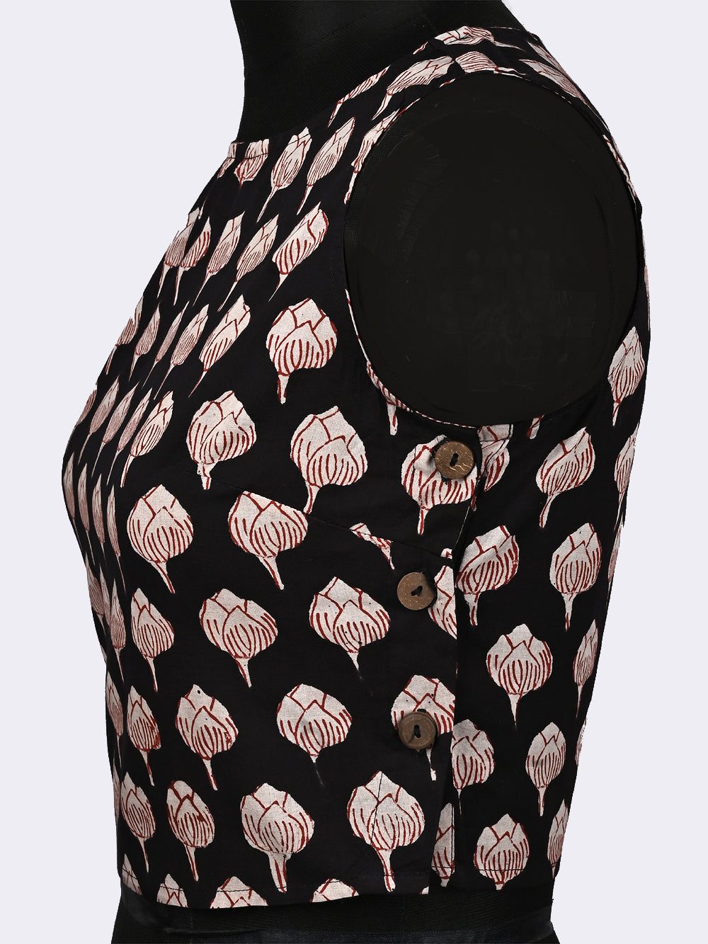 Natural Black Brahma Kamal Sleeveless Hand Block Printed Cotton Blouse