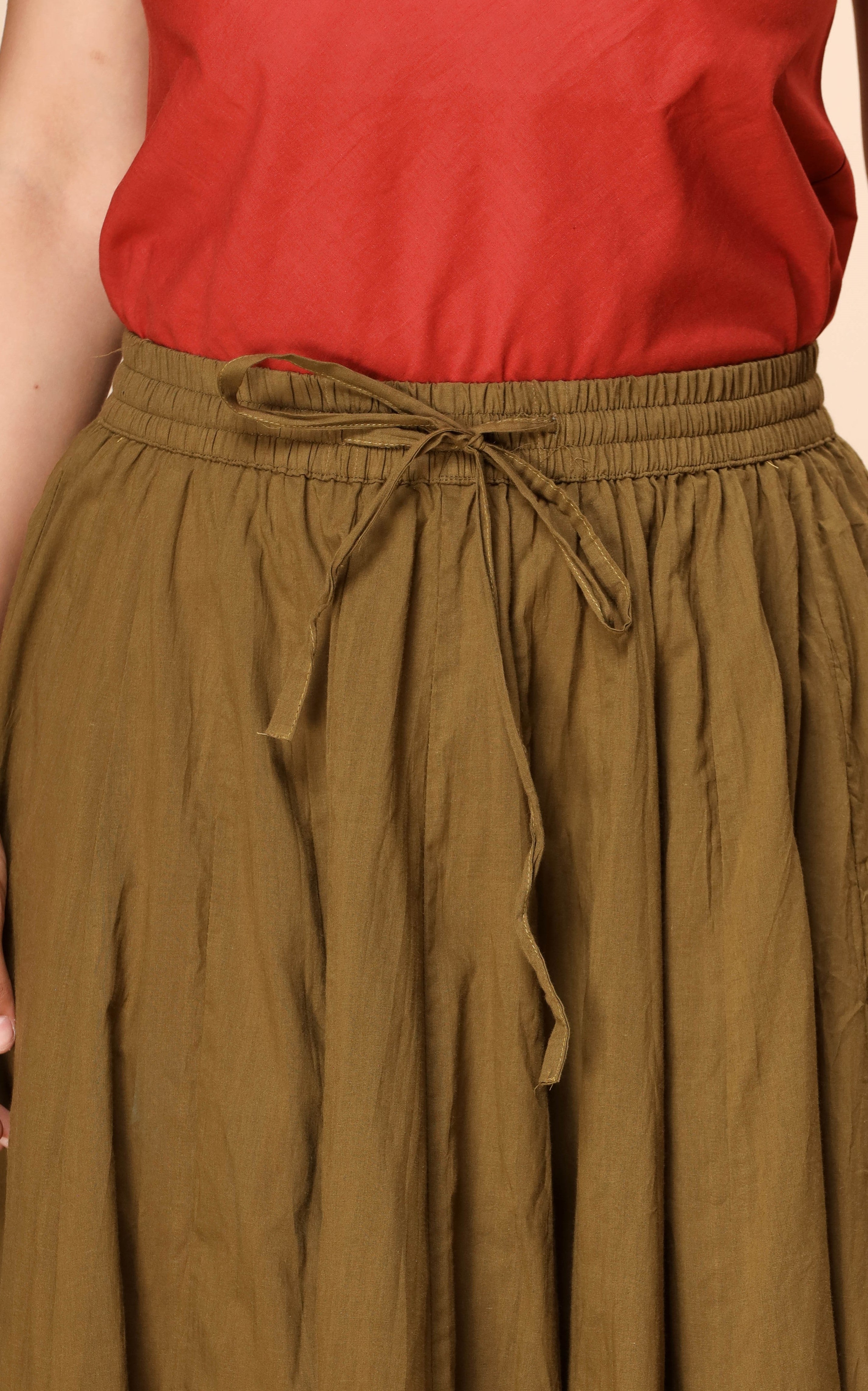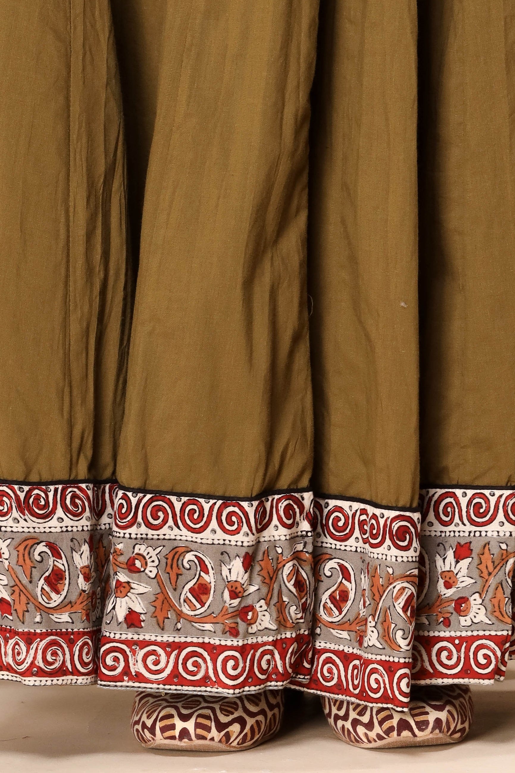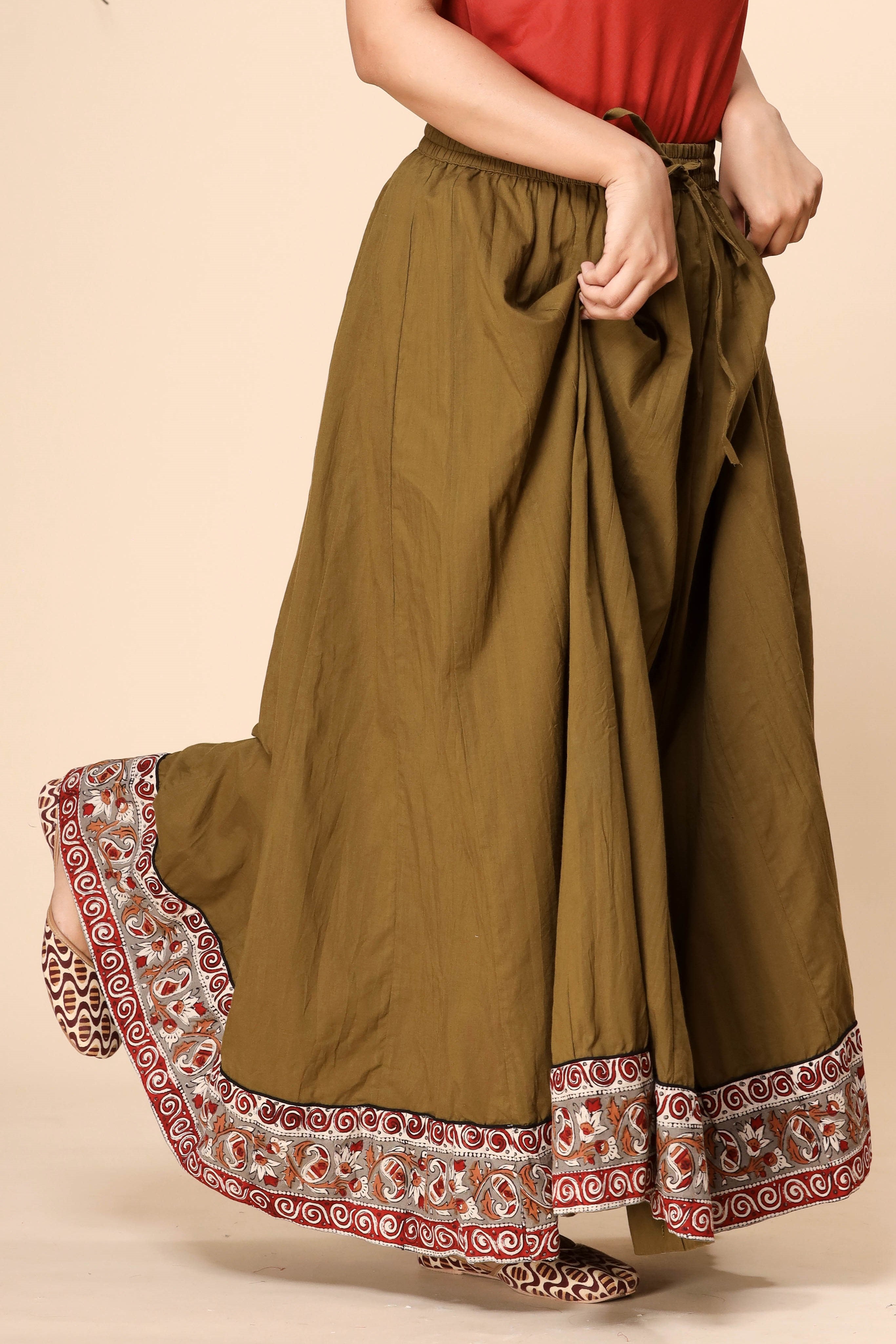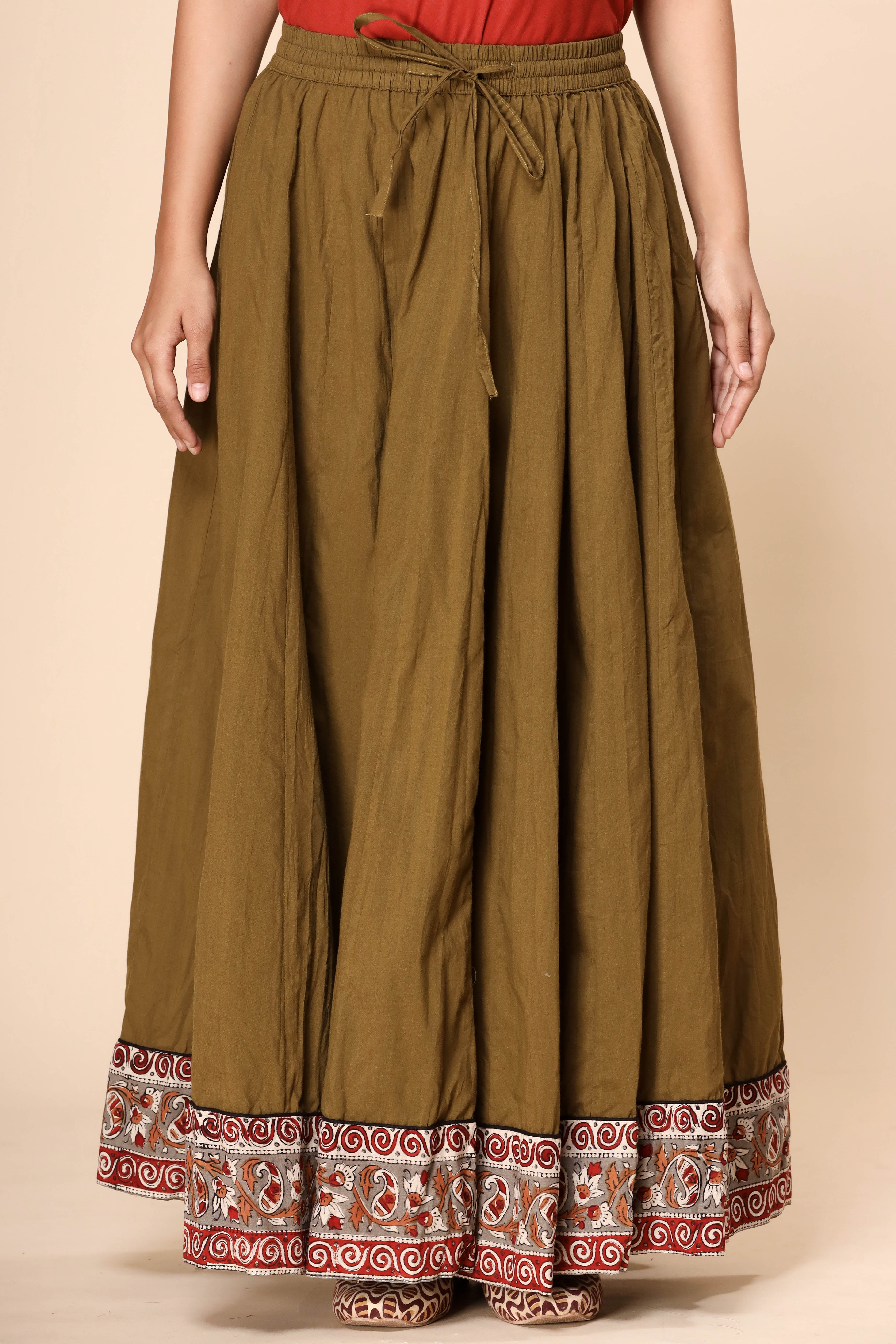 Plain Dyed Mehendi Green with Kalamkari Border Crinkled Cotton 28 Kali Kalidaar Skirt