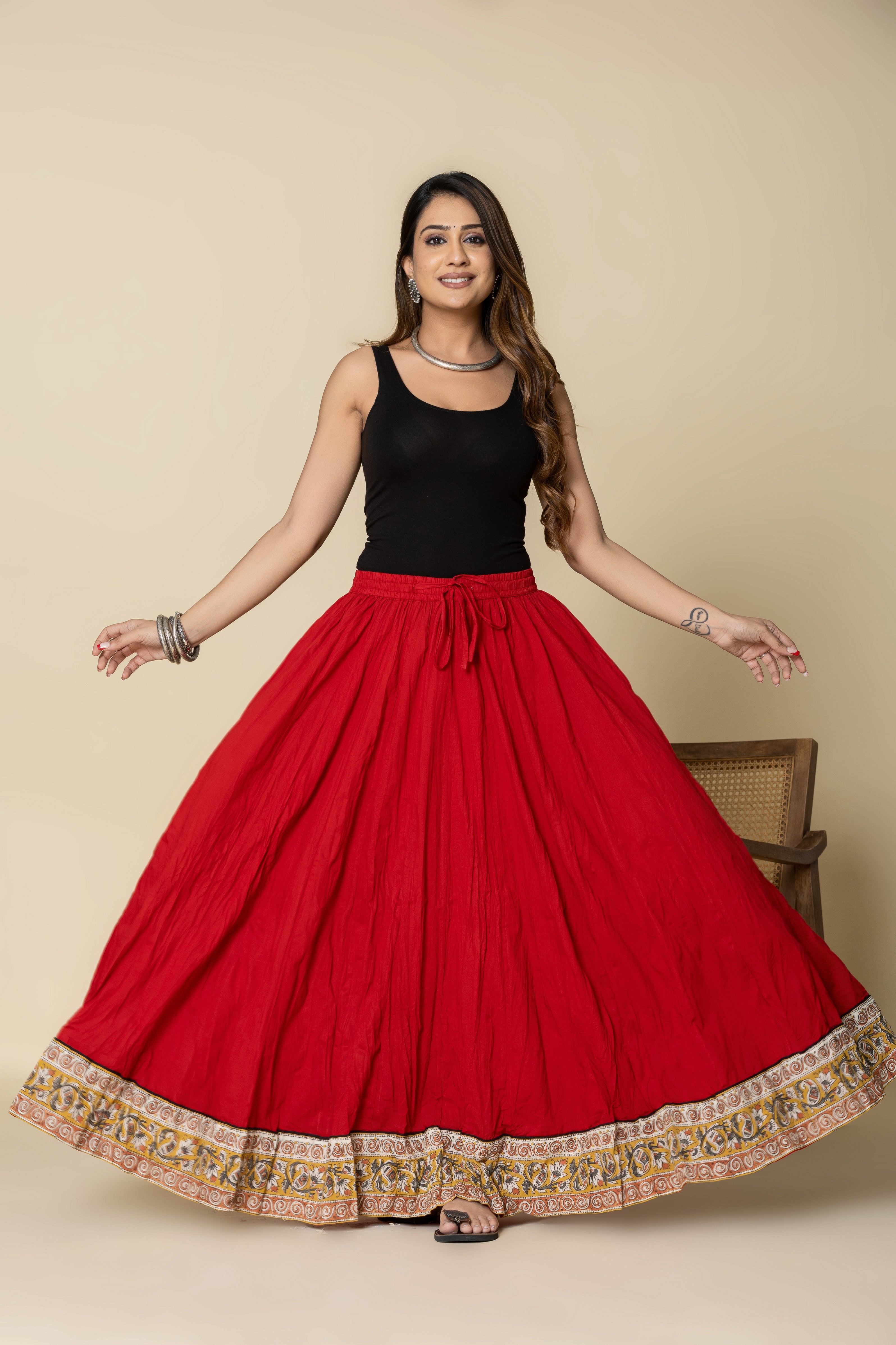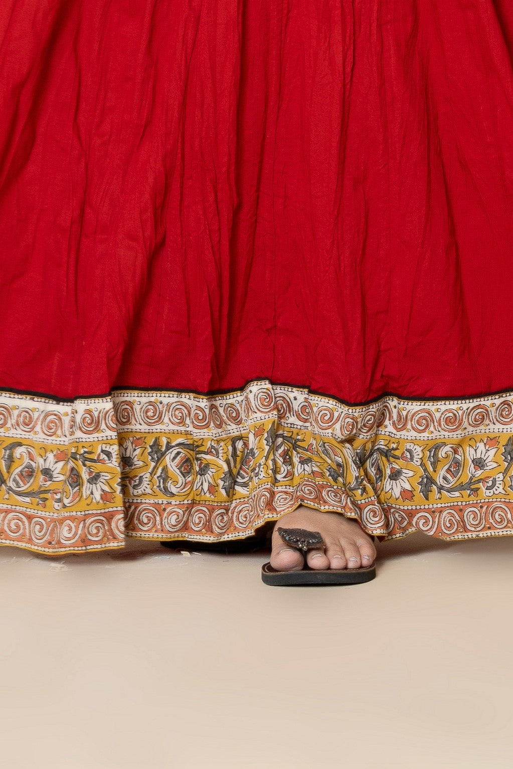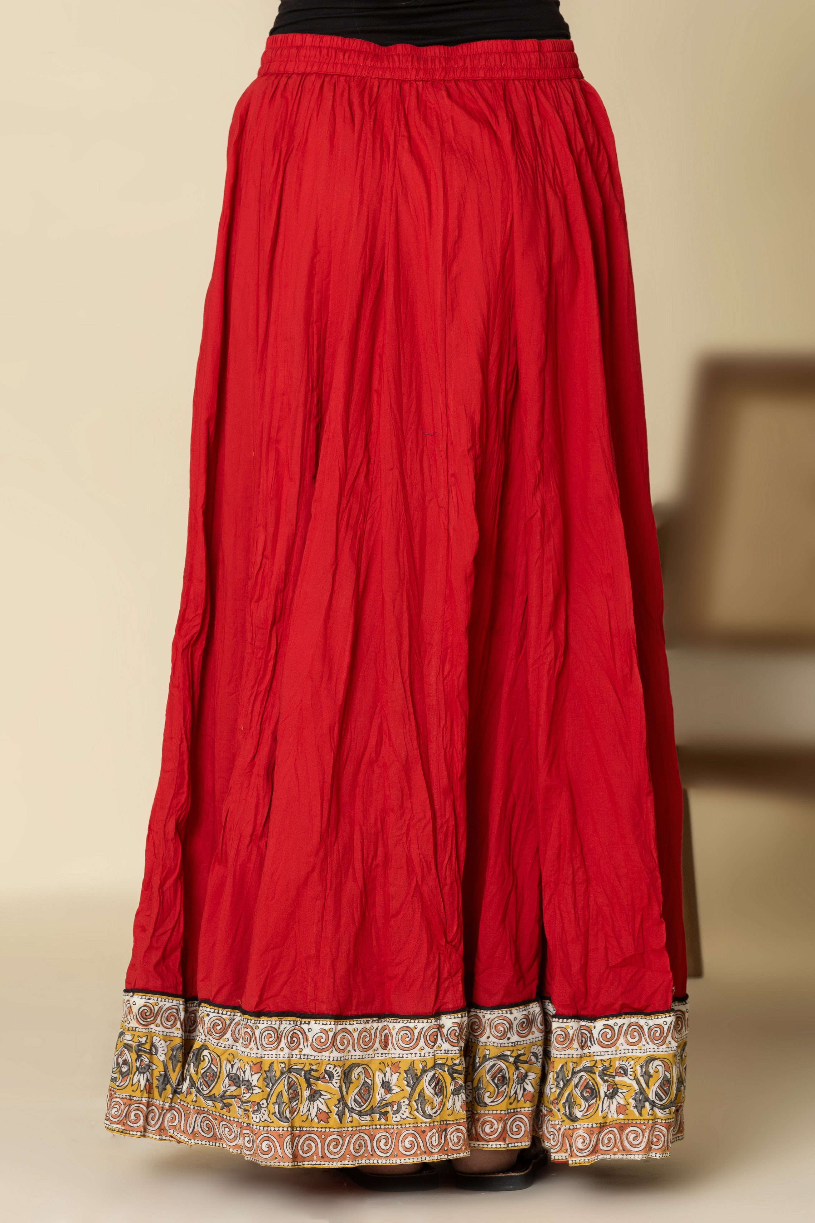 Plain Dyed Red with Kalamkari Border Crinkled Cotton 28 Kali Kalidaar Skirt